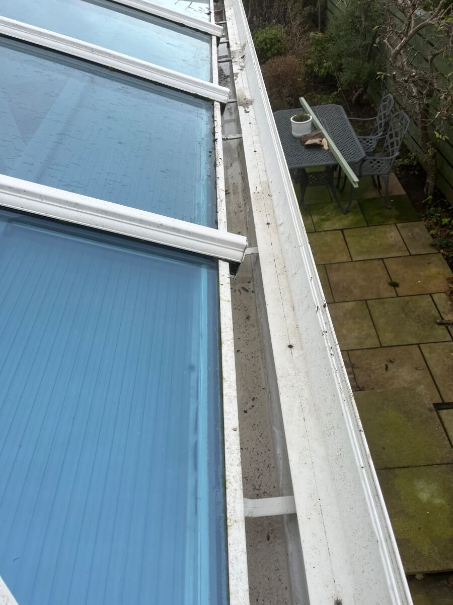 Conservatory gutter and downpipe cleaning: gutters were thoroughly cleaned, water flow tested to confirm free drainage, and all debris removed from site. Work was completed with proper care and full adherence to safety procedures.